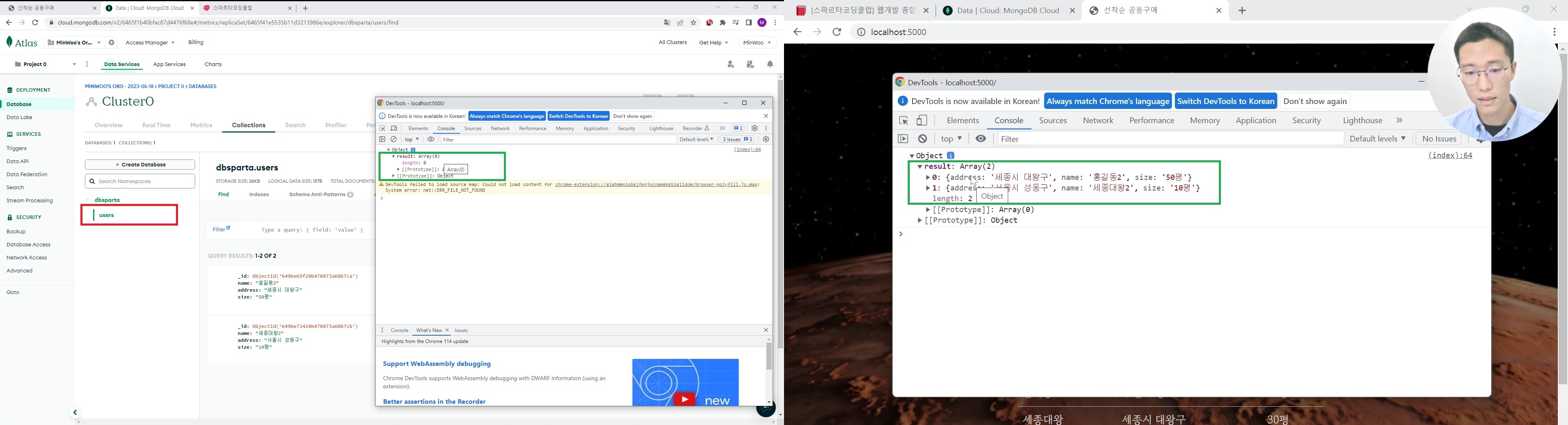 Console의 결과가 강의와 달라 MongoDB를 확인해보니, 데이터가 users 폴더에 저장되고 있었다.