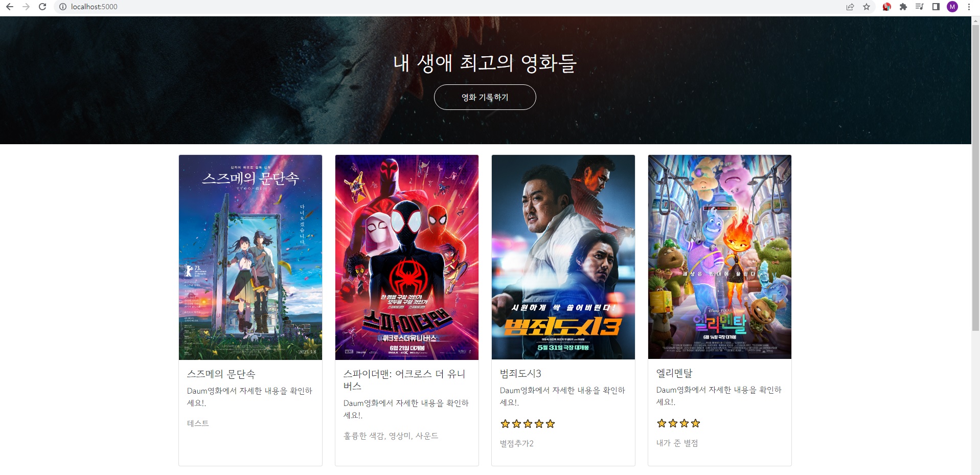 숙제는 별점을 선택해서 [기록하기] 버튼을 누르면 DB에 저장, 웹페이지에 카드 등록될 때 별점이 같이 나오도록 하는 것이다.