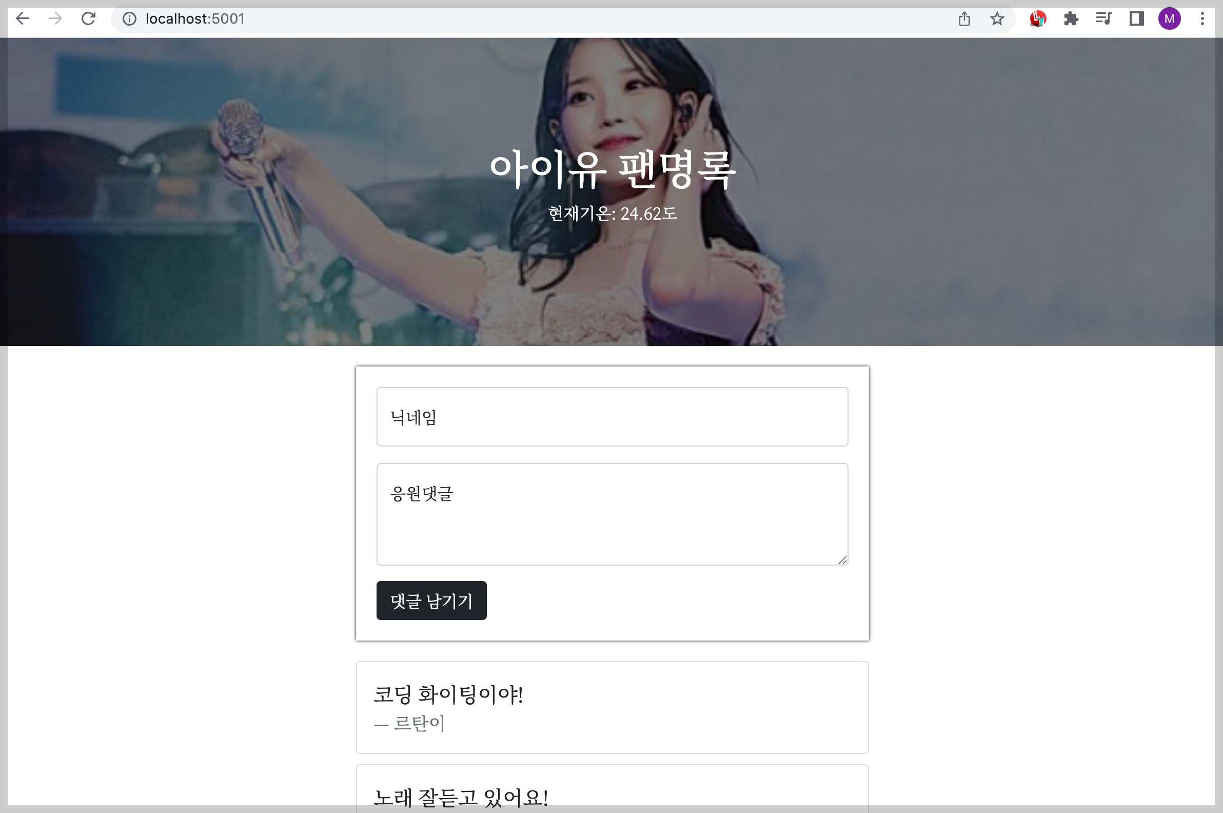 @app.route("/guestbook", methods=["GET"]) def guestbook_get(): all_comments = list(db.fan.find({},{'_id':False})) return jsonify({'result': all_comments})웹페이지에 GET요청을 하면 DB로부터 데이터를 불러온다.