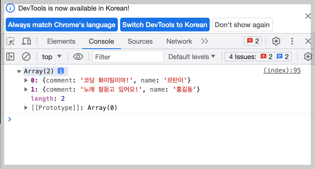function show_comment() { fetch('/guestbook').then((res) => res.json()).then((data) => { let rows = data['result'] console.log(rows) }) }rows 변수에 DB로 부터 받아온 모든 댓글들을 받아주고,